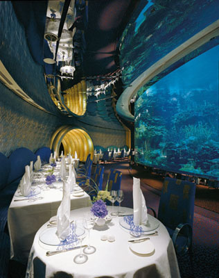 到过那里,您才能体会到真正意义的“金碧辉煌”。它的中庭是金灿灿的,滚动电梯两旁是10几米高的水族箱,一边乘电梯一边就像漫游在海洋馆。客房面积从170平方米到780平方米不等,落地玻璃窗可以270度看海景;卫生间超过25平方,设有巨大的按摩浴缸;大堂的地板上、房间的门把手、卫生间的配件都是不折不扣的黄金;沐浴产品全都是Hermes的。最低房价每晚1000美元,饭店有1500名服务生,也就是说,平均每个套房有7名服务生侍候。