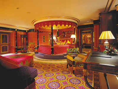 与酒店外表一袭清纯白色外衣不同,伯瓷的内部极尽奢华。走进大门,当偌大的“宫殿”呈现在眼前时,我突然有种惶惑,可能是辉煌的东西总给人压迫感吧。据说在伯瓷,凡眼睛判断为金色的东西,定是黄金无疑。大到厅里的巨型柱子,小到门把、家具手柄、水龙头、电话等等,都用黄金装饰得优雅而不落俗套,以至于记者看见镀金的留言纸时,已没什么强烈感觉了。据说,酒店当年装修耗金30吨。如果当真,扣除大堂、餐厅等公用部分的消耗外,每套客房的含金量至少也有几十斤。