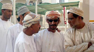 几名带头巾的阿曼男子在首都马斯喀特路边交谈。
