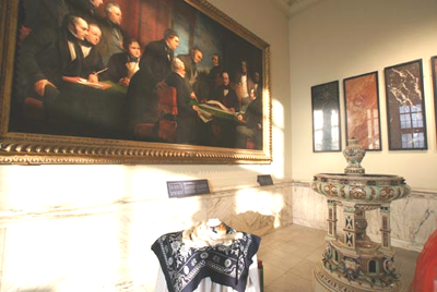 在展览场地,由于墙上大幅历史名画“水晶宫的诞生”无法移动和遮掩,给布置带来一定难度,但后来利用展品“巧饰”创意,重新解构名作,对以讲述故事为形式的世博会展览倒提供了一个极佳的展品,也为创作提供了绝妙的背景。