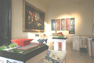 策展时,在画幅下方安放了一组2010年上海世博会的模型——中国馆小模型和英国馆模型。平面图景讲述着世博会的过去,立体模型憧憬着世博会的未来,展览利用视觉将时间、空间交织在一起。