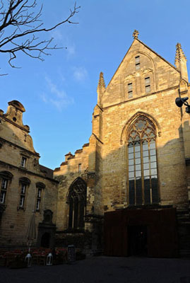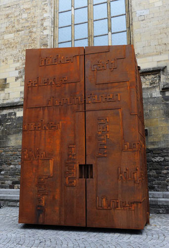 在马斯特里赫特蜿蜒的石砖道路上信步而行,宛如置身于中世纪,不知不觉间我来到城中心的Vrijthof广场附近,偶然拐进一个小巷,古老的教堂前面一座赭红色的巨大雕塑吸引了我,上前一看,才发现是一本“书”,表面雕刻着很多字母,英文的“Book”提醒了我,莫不是那个著名的教堂书店 Selexyz Dominicanen?来荷兰之前在网上看到马斯特里赫特有这样一家建在13世纪教堂里的独一无二的书店,太好了,没想到这么容易就找到了。