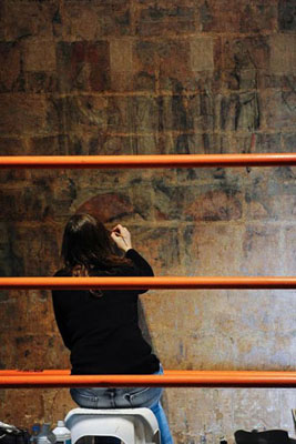 然而改造工程也并非想象得那样简单,首先要将几十年来带给当地人无数快乐的节日嘉年华迁出,毕竟这里留下了几代人的美好记忆,不过终于在市中心另外选择了一处场所。而改造项目从一开始起,就严格遵循了不能改动和破坏教堂任何内容的原则,根据协议,教堂的外墙以及基础设施改造有市政府负责,内部由书店完成。Ton Harmes先生给我看了2001年以前的教堂图片,那时还是自行车存车库,灰暗的墙壁,斑驳破旧不堪。为此一个专门的教堂改造项目小组成立,包括建筑师和考古学家,特别是关于屋顶壁画的修复工作,这也是Ton Harmes先生非常引以为豪的,因为接管这个教堂的时候,根本就看不出来屋顶上的壁画,工作人员花费了差不多将近一年的时间才把这些壁画清理出来,人们现在才可以欣赏到如此艳丽的作品。我注意到北面墙边一个脚手架上,一位女士正专心致志地描绘着一副古老的壁画,这是目前书店正在进行的关于十四世纪古老壁画的维修项目。