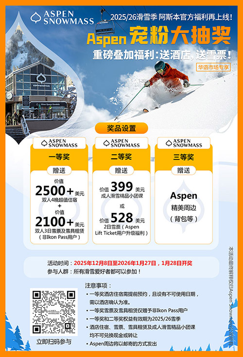送酒店、送雪票!快来参加美国Aspen 2025/26雪季宠粉大抽奖! | |||
