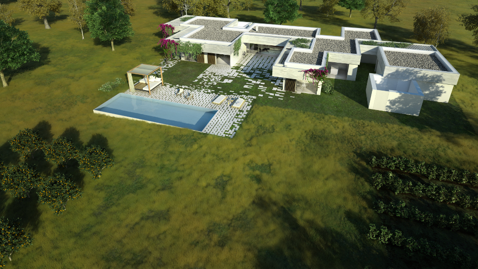 我们的别墅用当地的基岩作为地基。别墅的中庭是一片露天场所,可以作为公共活动区。每套别墅都有宽敞的客厅;在其周围,我们开发了一些开阔的空地,使之与大自然形成各种不同的氛围。