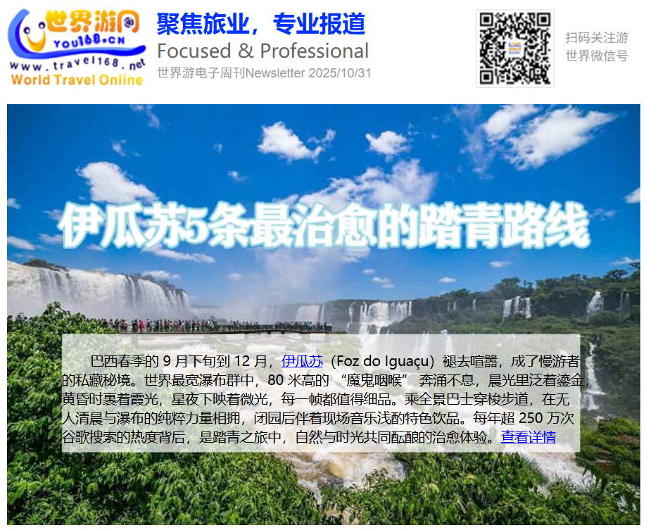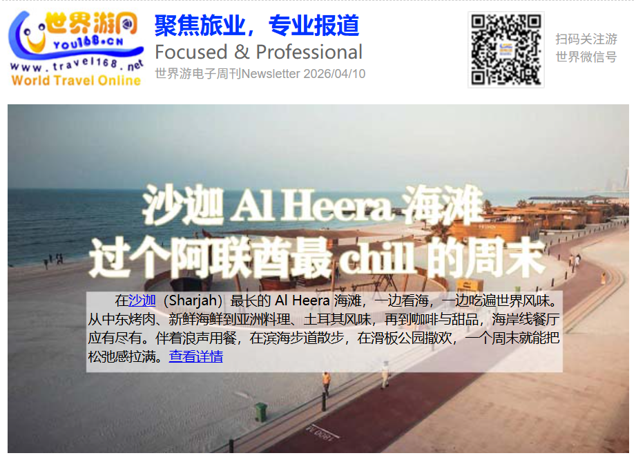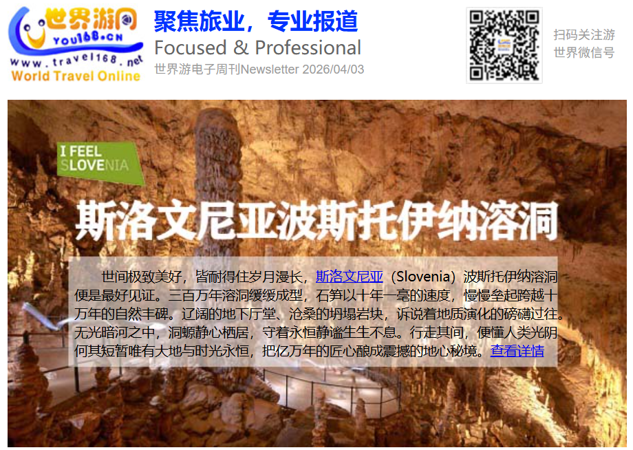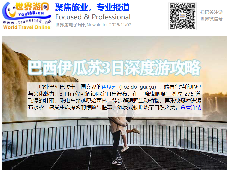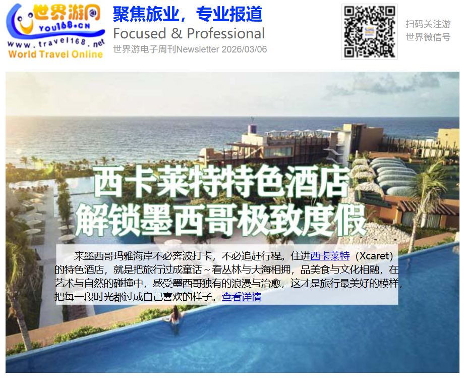 世界游网电子刊每周五发行,秉承中国出境旅游资讯门户的宗旨,内容精选当周最热门的新闻动态、最具价值的权威信息、最火爆的旅游话题等,为广大出境旅游行业人士提供一个“无搜索,知百事”的电子新闻平台。