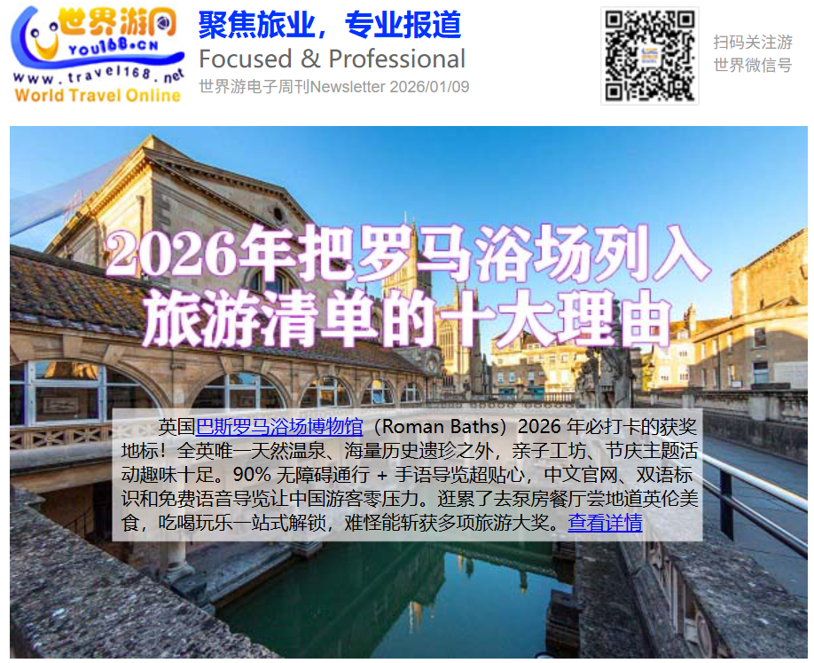 世界游网电子刊每周五发行,秉承中国出境旅游资讯门户的宗旨,内容精选当周最热门的新闻动态、最具价值的权威信息、最火爆的旅游话题等,为广大出境旅游行业人士提供一个“无搜索,知百事”的电子新闻平台。