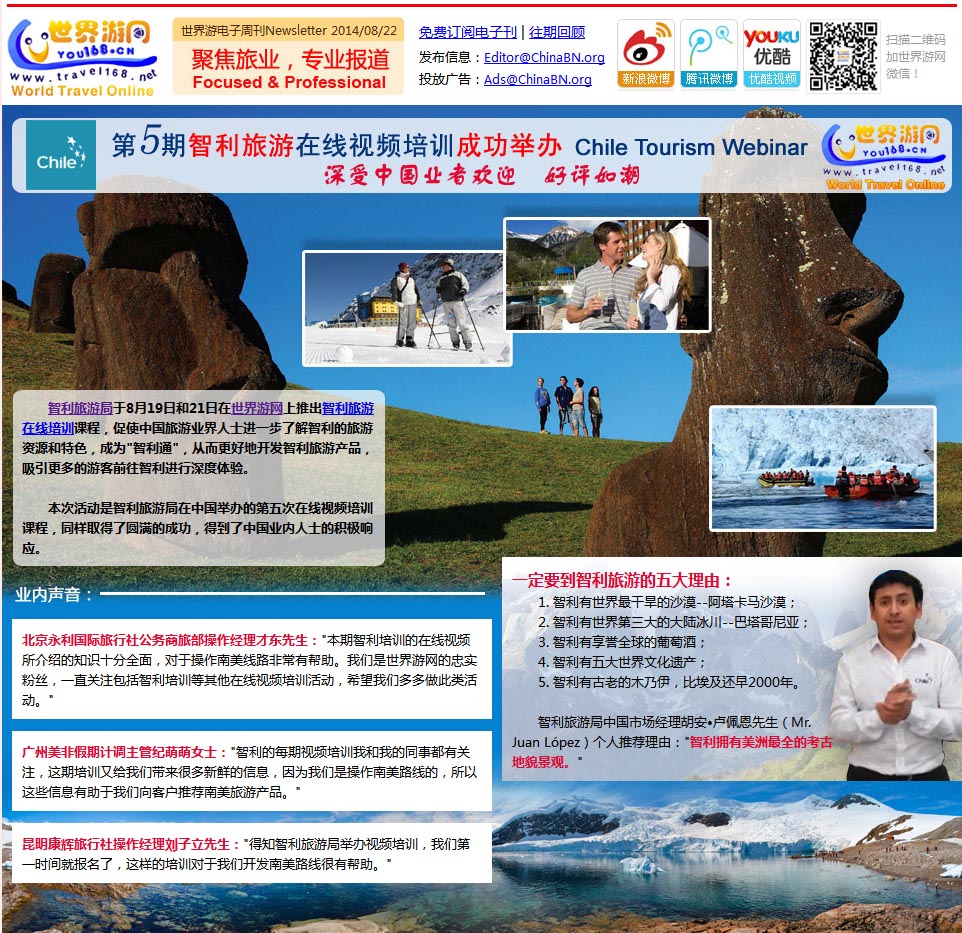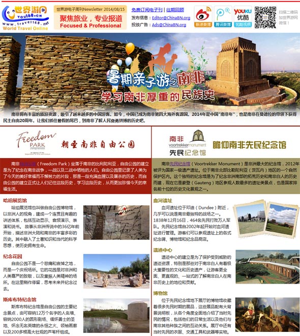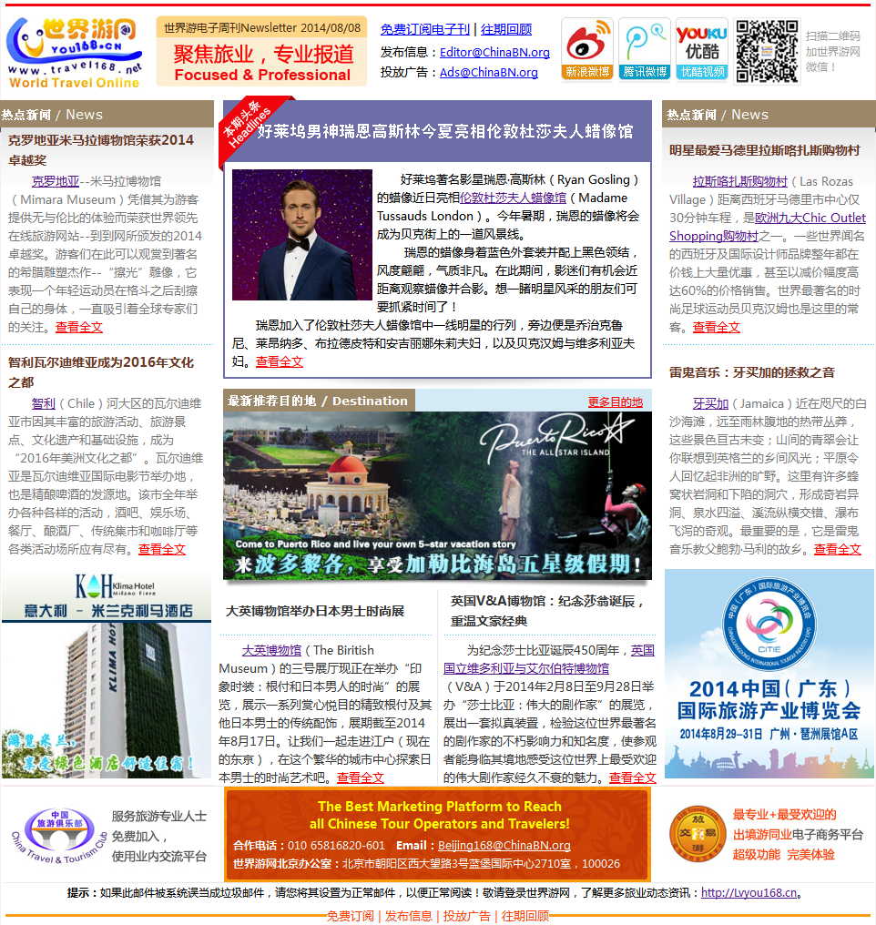 世界游网电子刊每周五发行,秉承中国出境旅游资讯门户的宗旨,内容精选当周最热门的新闻动态、最具价值的权威信息、最火爆的旅游话题等,为广大出境旅游行业人士提供一个“无搜索,知百事”的电子新闻平台。