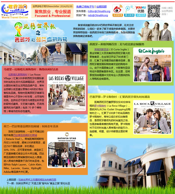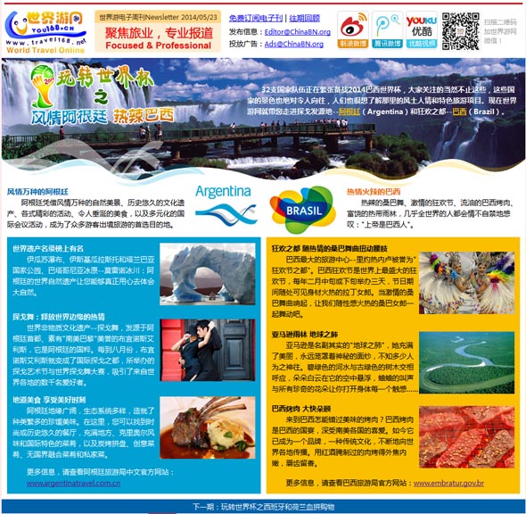 世界游网电子刊每周五发行,秉承中国出境旅游资讯门户的宗旨,内容精选当周最热门的新闻动态、最具价值的权威信息、最火爆的旅游话题等,为广大出境旅游行业人士提供一个“无搜索,知百事”的电子新闻平台。