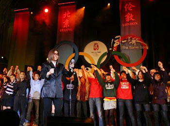 因为奥运,北京和伦敦有了共同的语言。2月12日晚,英国伦敦著名的威斯敏斯特中央大厅上演了一场以“放歌奥运”为主题的中国中央电视台“同一首歌”暨中英妇女文化周歌舞晚会。约1400名中英观众在欢庆中国新春佳节的同时,还为即将举行的北京奥运会和4年后的伦敦奥运会放歌起舞。