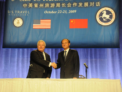 23日,邵琪伟与罗杰·道代表中美旅游业共同签署《中美旅游战略合作议定书》,并在签字仪式后共同举办了新闻发布会。《议定书》在共同致力提升旅游产业地位、加强中美旅游宣传推广互动机制、进一步推动中美旅游友好省州结对机制、建立中美旅游应急合作机制、推动中美旅游互访手续的便利五个方面达成了共识。