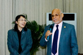 特立尼达和多巴哥旅游局市场总监杰森•巴蒂斯特先生在介绍旅游资源时,世界游网市场总监阮宏女士提供协助,进行中文解说。